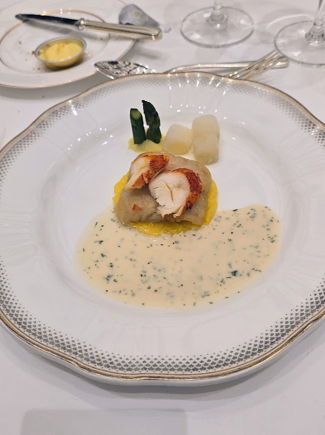 【甘鯛のソテー メダルオマール海老飾り サフラン風味リゾット敷き アスパラガスとポテト添え ハーブが香る白ワインソース】